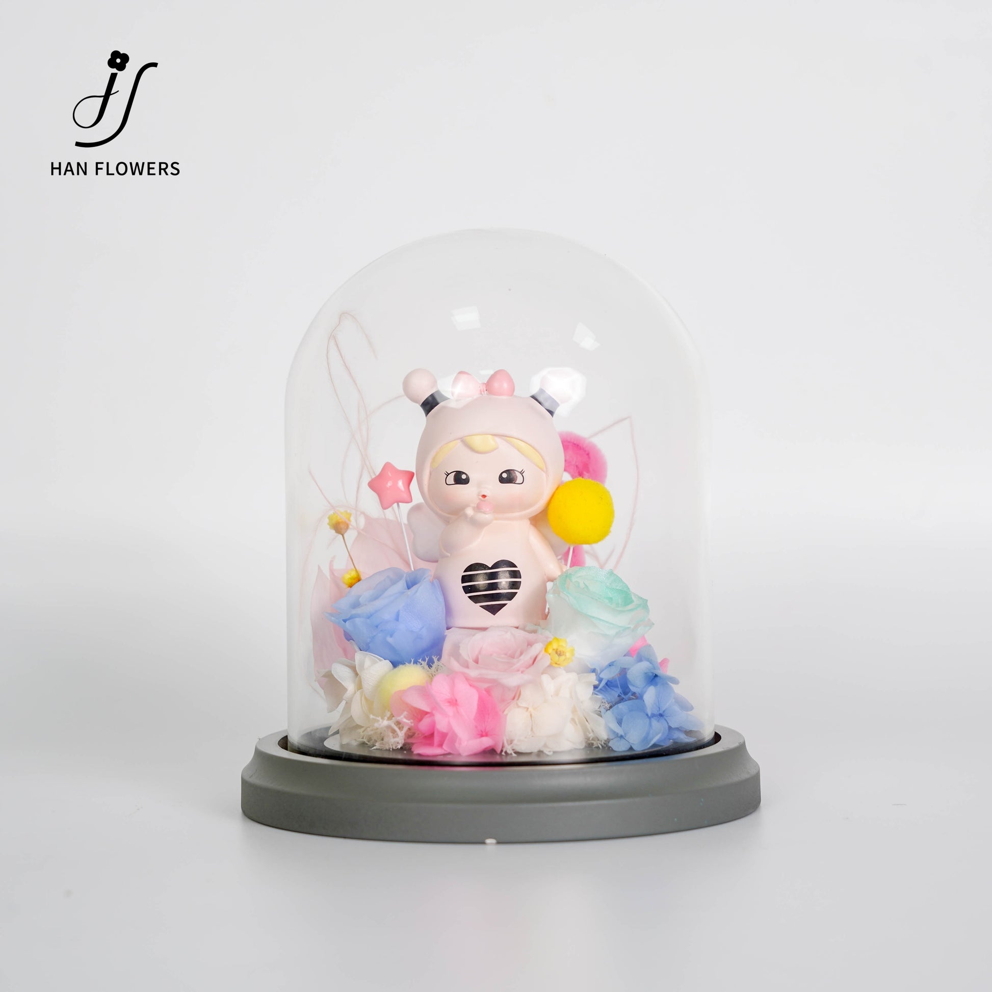 這是花與萌趣的奇妙冒險!透明罩是魔法護盾,蜜蜂娃穿「愛心蜂衣」超可愛,粉玫瑰當夥伴、紫花當引路精靈,彩絲帶像魔法光線繚繞,灰底座是冒險起點,整個擺件像從童話書跳出來,藏著無數可愛祕密~